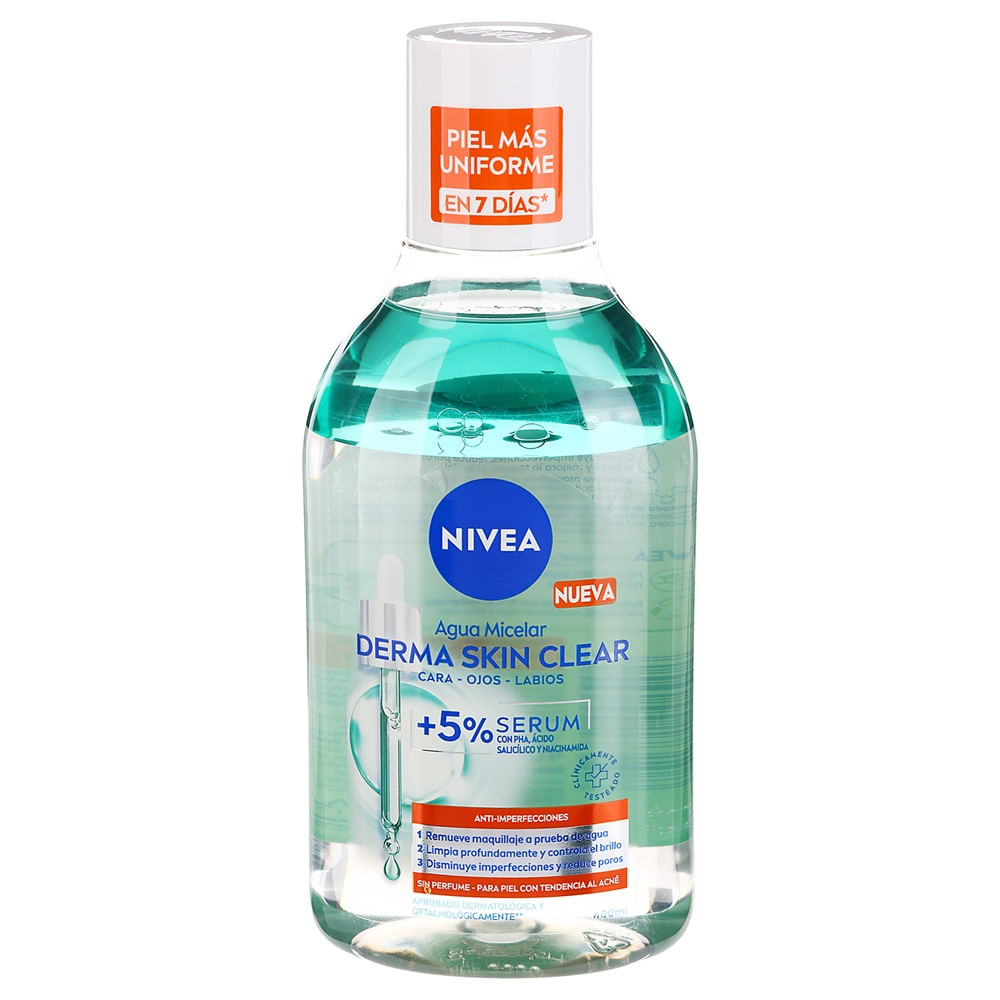 Agua micelar Nivea Derma Skin Clear 400 ml, solución limpiadora que elimina impurezas, maquillaje y exceso de grasa sin resecar la piel. Su fórmula suave respeta el equilibrio natural de la piel, ideal para uso diario en rostro. Deja una sensación de frescura y limpieza profunda, sin necesidad de enjuagar. Presentación de 400 ml, práctica para tu rutina de cuidado facial.