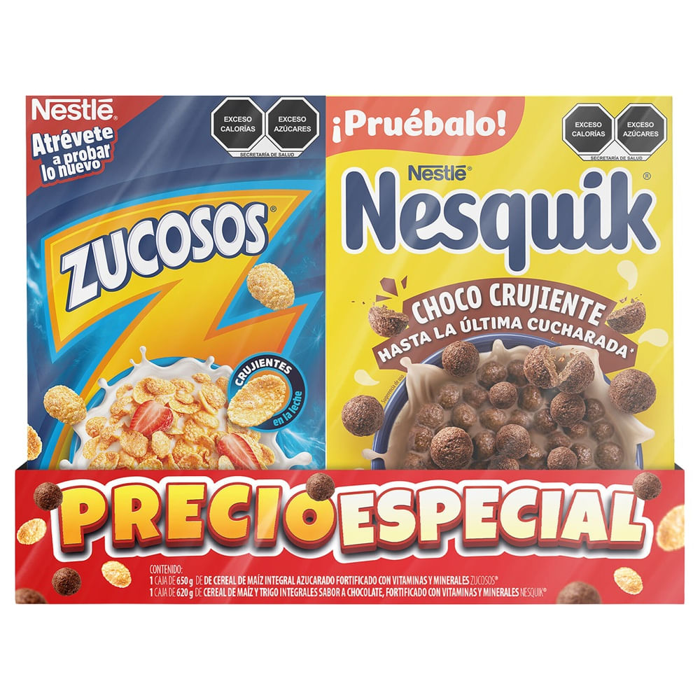 La Cereal Nestlé Nesquik 620 g + Zucosos 650 g es un práctico combo ideal para el desayuno de toda la familia, que combina cereal sabor chocolate con hojuelas dulces de maíz. Ofrece variedad de sabores y texturas, perfecto para disfrutar con leche, yogurt o fruta. Ambos cereales están elaborados con granos integrales y fortificados con vitaminas y minerales que aportan energía al iniciar el día.