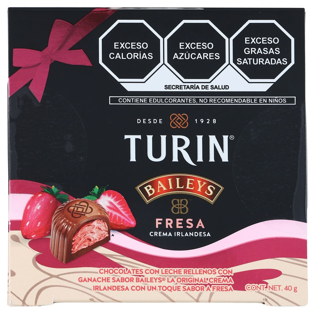 Chocolate Turín sabor fresa en presentación de 40 g, elaborado con chocolate con leche y un relleno cremoso que combina notas dulces y afrutadas. Su textura suave y su sabor distintivo lo convierten en una opción perfecta para consentirte o regalar. Contiene un relleno tipo crema inspirado en sabores como Baileys con toque de fresa, lo que le da un perfil más especial y diferente a los chocolates tradicionales.