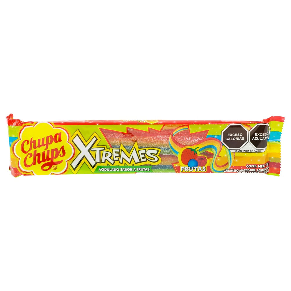 Chupa Chups Xtremes frutas 57 g, deliciosas tiras de dulce con un sabor intensamente frutal y un toque acidito que las hace irresistibles. Su combinación de sabores dulces y ácidos crea una experiencia explosiva en cada bocado, ideal para quienes disfrutan de los dulces más intensos. Estas tiras tienen una textura suave y masticable tipo gomita, con una ligera capa azucarada que resalta su sabor. Su presentación en bolsa es práctica para llevar y disfrutar en cualquier momento del día.