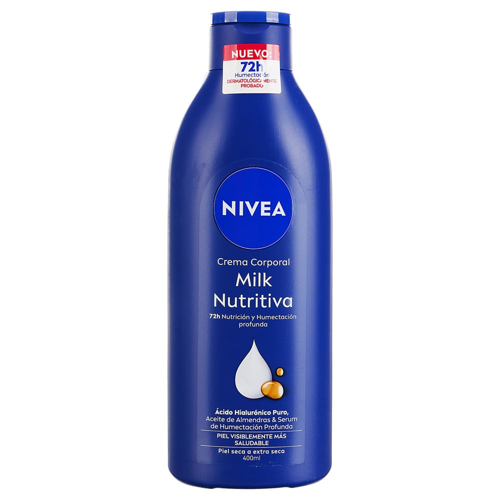 Crema Nivea Body Milk Nutritiva 400 ml, hidratante corporal que aporta nutrición profunda para mantener la piel suave y saludable. Su fórmula enriquecida ayuda a reforzar la barrera natural de la piel, brindando hidratación duradera sin sensación grasosa. De absorción rápida, ideal para uso diario en todo el cuerpo. Presentación de 400 ml, práctica para cuidar tu piel en casa.