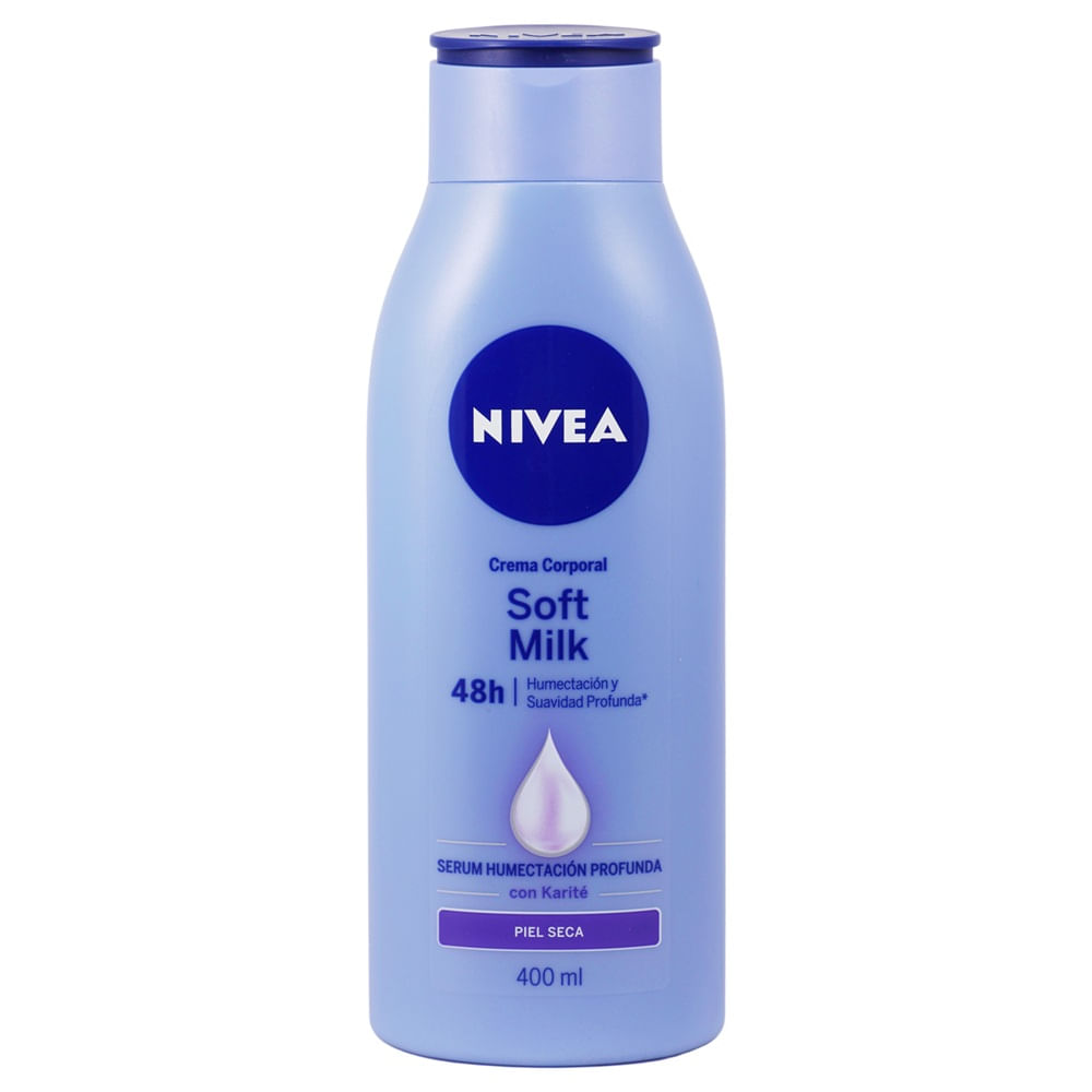 Crema Nivea Body Soft Milk piel seca 400 ml, hidratante corporal especialmente formulada para piel seca que proporciona nutrición profunda. Su textura suave y ligera se absorbe fácilmente, dejando la piel confortable y sedosa. Ayuda a mantener la hidratación durante todo el día sin sensación grasosa. Presentación de 400 ml, ideal para uso diario en cuerpo completo.
