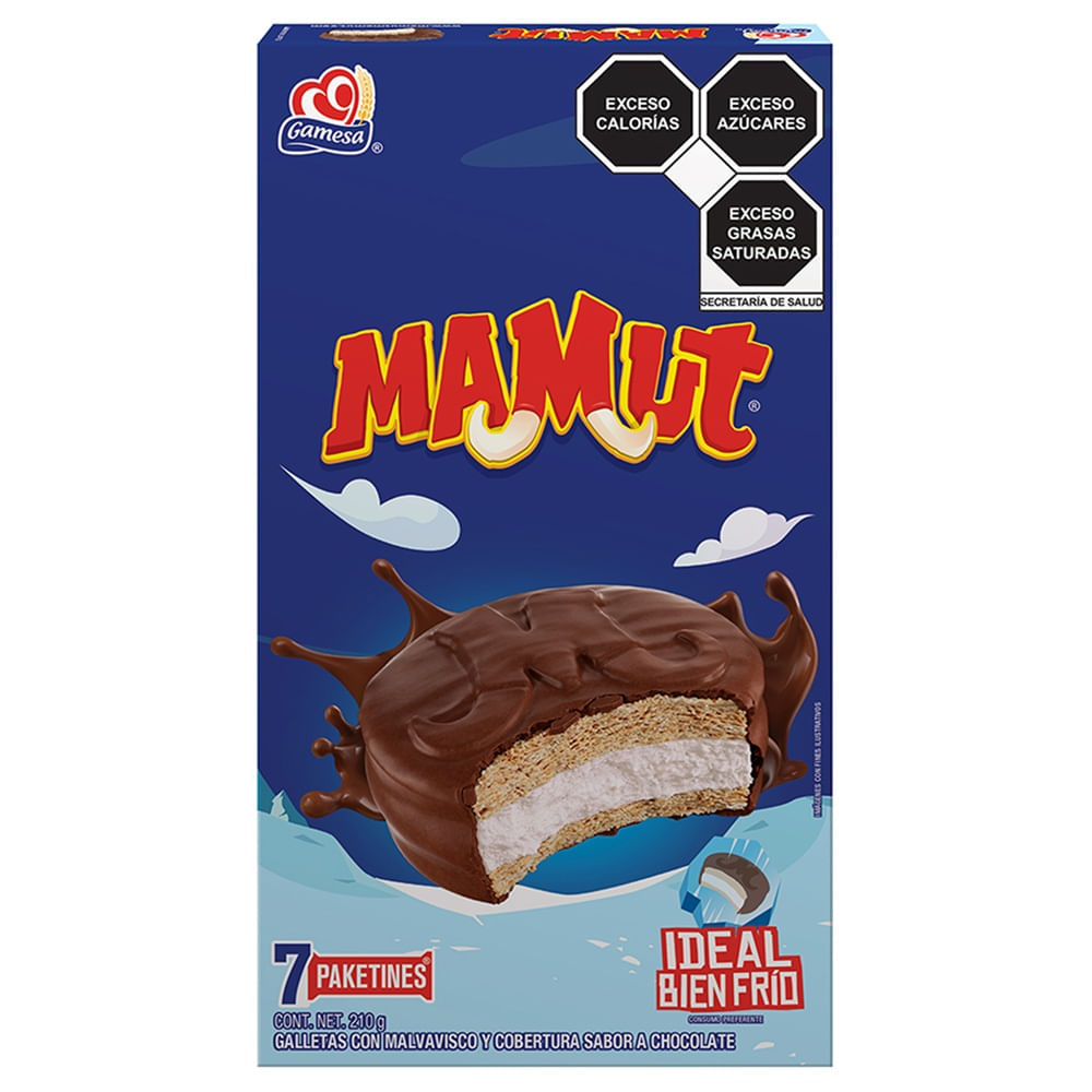 Galleta Gamesa Mamut 210 g, un clásico antojo que combina dos galletas suaves con un relleno esponjoso de malvavisco y una cobertura sabor chocolate. Su mezcla de texturas entre lo crujiente y lo suave la hace una opción irresistible para disfrutar en cualquier momento. Viene en presentación con piezas individuales, lo que la hace práctica para llevar a la escuela, oficina o como snack durante el día. Su sabor dulce y tradicional la convierte en una favorita tanto para niños como adultos.