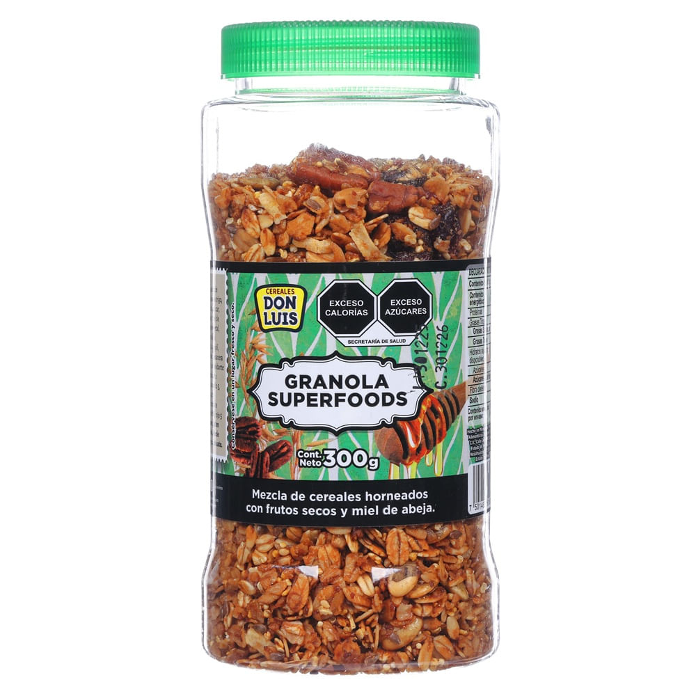 La Granola Don Luis Superfoods 300 g es una mezcla nutritiva de cereales horneados combinados con semillas, frutos secos y un toque de miel, ideal para iniciar el día con energía. Su contenido tipo “superfoods” aporta fibra y nutrientes que favorecen una alimentación equilibrada. Puede disfrutarse sola o como complemento en yogurt, fruta o licuados.
