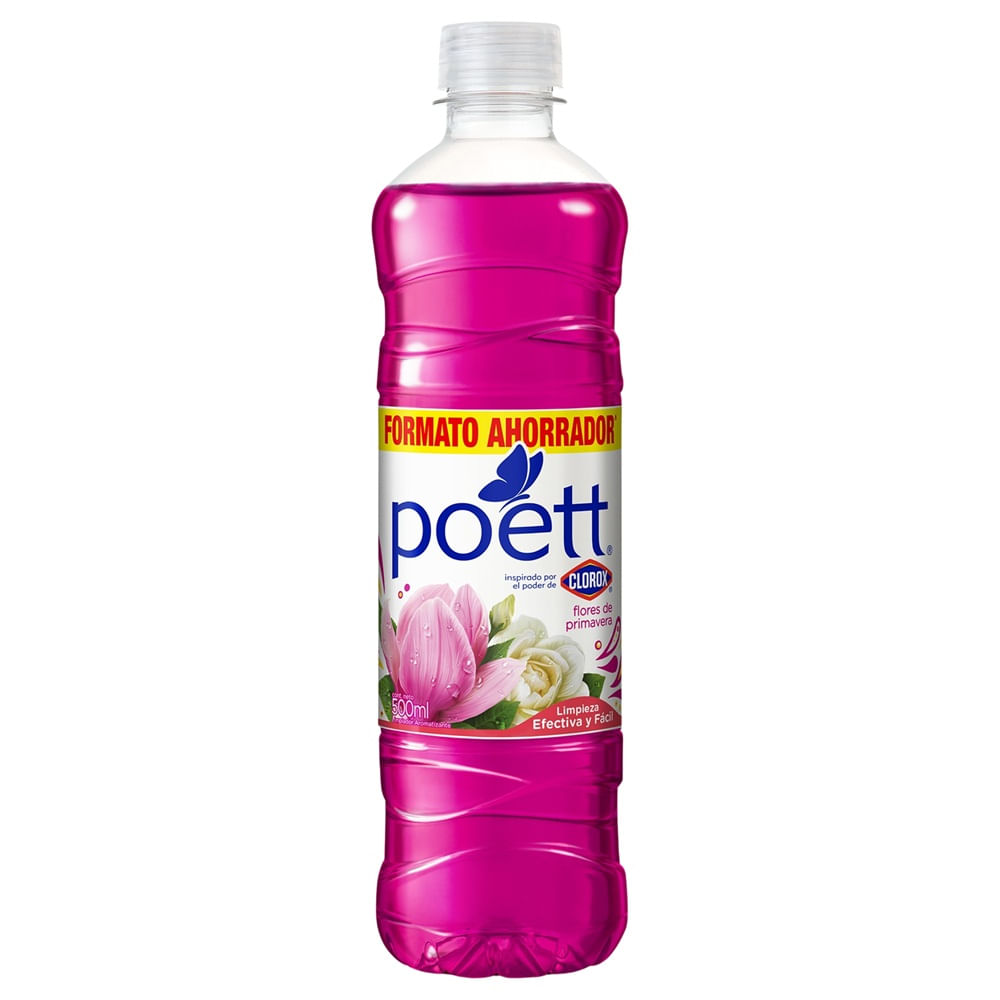 Limpiador Poett Flores de Primavera en presentación de 500 ml, ideal para limpiar y aromatizar diferentes áreas del hogar. Su fórmula es versátil y puede usarse en pisos, cocina, baño y otras superficies lavables.