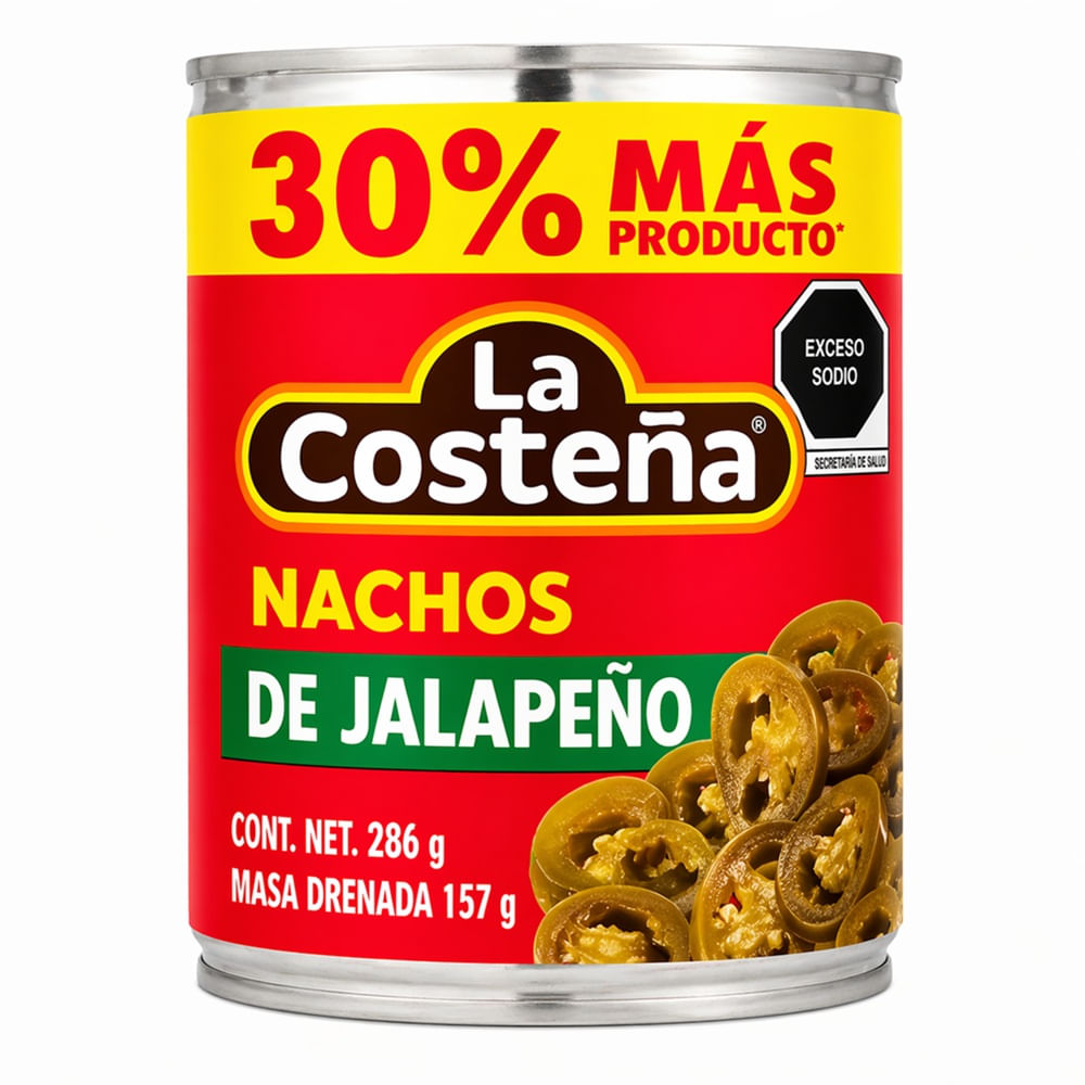 Los Nachos La Costeña de jalapeño 286 g son chiles jalapeños en rodajas conservados en escabeche, con un sabor intenso entre ácido, picante y especiado. Son perfectos para acompañar nachos, pizzas, hot dogs o cualquier platillo al que se le quiera agregar un toque picosito. Tienen una textura firme y jugosa que se mantiene al servirlos, realzando el sabor de tus comidas. Su presentación de 286 g es práctica y lista para disfrutarse en cualquier momento.