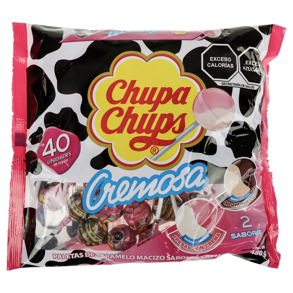 Paleta Chupa Chups surtido cremoso 40 piezas, deliciosas paletas con un sabor suave y cremoso que combina notas dulces tipo fresa con crema y chocolate con vainilla. Su textura es más ligera y agradable al paladar, ofreciendo una experiencia diferente a las paletas tradicionales. Una opción clásica y divertida que destaca por su sabor cremoso y variedad, perfecta para niños y adultos que buscan un antojo dulce con un toque diferente.
