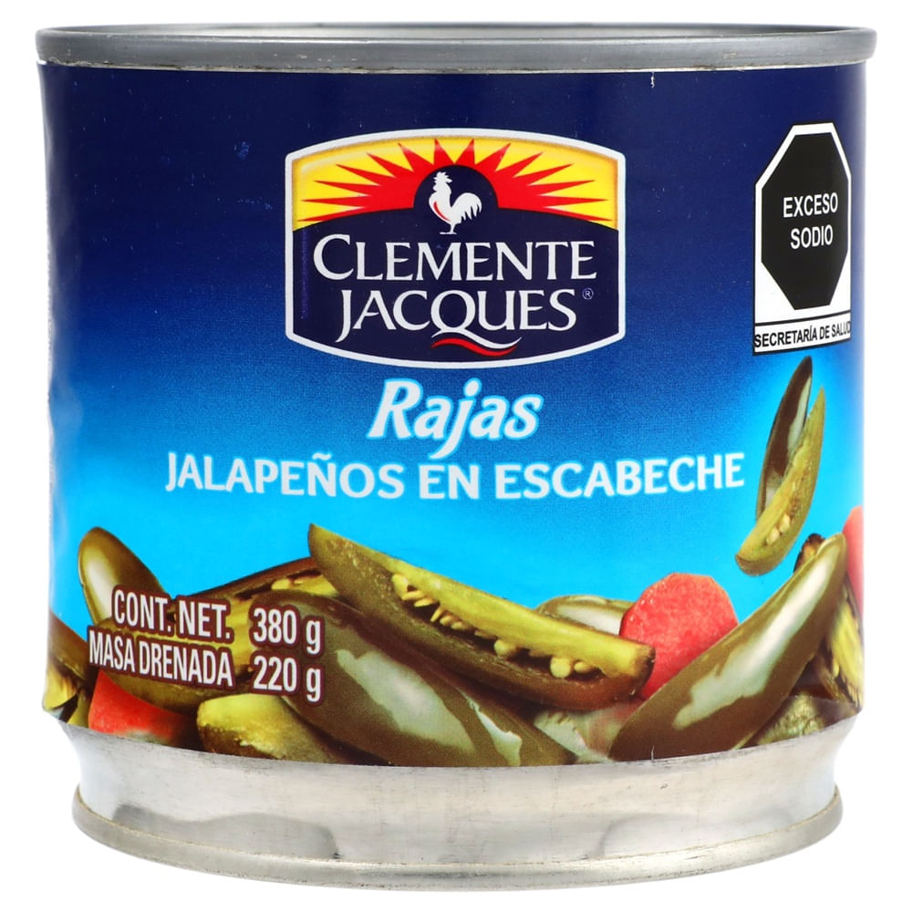 Rajas de jalapeños Clemente Jacques 380 g en escabeche, con un sabor equilibrado entre lo picoso y ligeramente ácido que realza cualquier comida. Están acompañadas de zanahoria y cebolla, lo que aporta un toque tradicional y más sabor en cada porción. Elaboradas con chiles jalapeños seleccionados, ofrecen una textura firme y jugosa, ideales para tacos, tortas, quesadillas, hot dogs o botanas. Su presentación en lata es práctica y lista para usarse en cualquier momento.