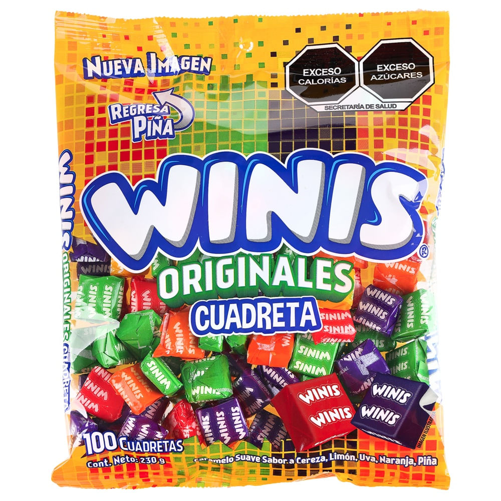 Caramelos Winis originales en presentación de bolsa con 100 piezas tipo cuadreta, con sabores surtidos como cereza, limón, naranja, uva y piña. Su textura suave y sabor dulce los hacen ideales para disfrutar en cualquier momento. Cada pieza es pequeña y práctica, perfecta para compartir, rellenar piñatas o armar bolsitas de dulces. Además, es una opción rendidora y económica para negocios o eventos.