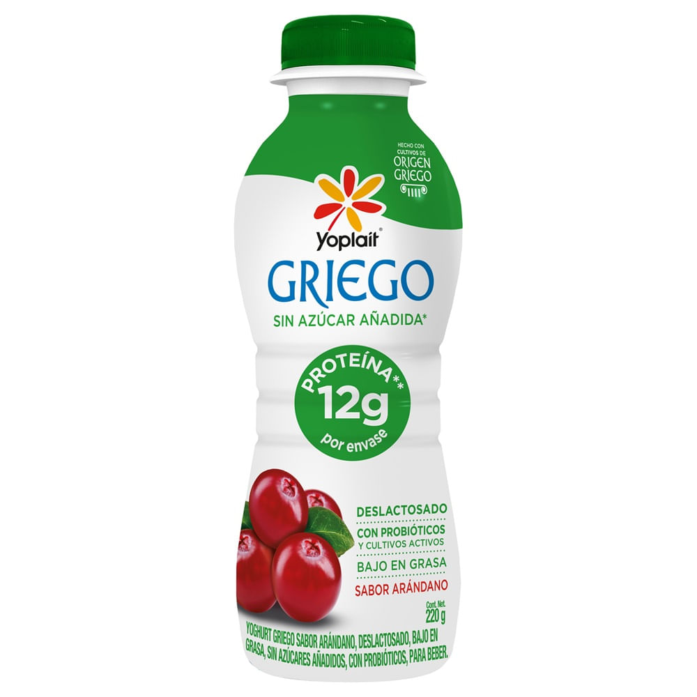 Yoghurt griego Yoplait sin azúcar sabor arándano en presentación de 220 g, ideal para disfrutar como snack o complemento en el desayuno. Su textura es cremosa y ofrece un sabor equilibrado a arándano sin azúcar añadida. Aporta proteína y está elaborado con leche y cultivos lácticos que contribuyen a una alimentación balanceada. Perfecto para llevar y consumir en cualquier momento del día.